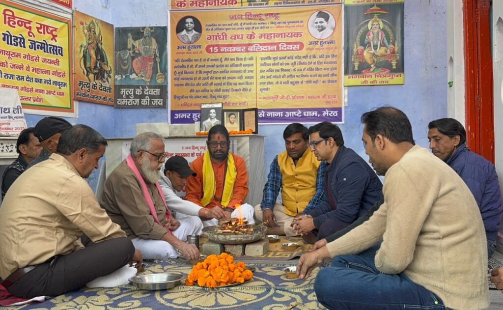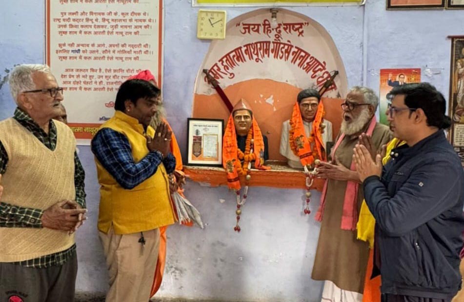 मेरठ 15 नवंबर (प्र)। आज मेरठ शहर शारदा रोड स्थित अमर हुतात्मा नाथूराम गोडसे नाना आप्टे धाम पर हिन्दू महासभा के महान नेता गांधी वध के महानायक नाथूराम गोडसे एवं नाना आप्टे जी का 15 नवंबर को 76 वा बलिदान दिवस पंडित अशोक शर्मा जी के पावन सानिध्य में मनाया गया। सर्वप्रथम कार्यालय परिसर में स्थापित दोनों परम पूज्य नेताओं की विश्व की सर्वप्रथम प्रतिमाओं को तिलक कर पुष्पमाला अर्पण कर हवन पूजा अनुष्ठान गायत्री मंत्र का जाप कर महामृत्युंजय मंत्र का जाप कर मां बगलामुखी के मंत्र का जाप कर गांधी वध में शामिल सभी महान हिंदू वीरों को याद करते हुए सभी महापुरुषों का स्मरण कर श्रद्धांजलि अर्पित की गई।
