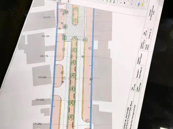 डिवाइडर के बीच फुटपाथ और ड्रेनेज सिस्टम